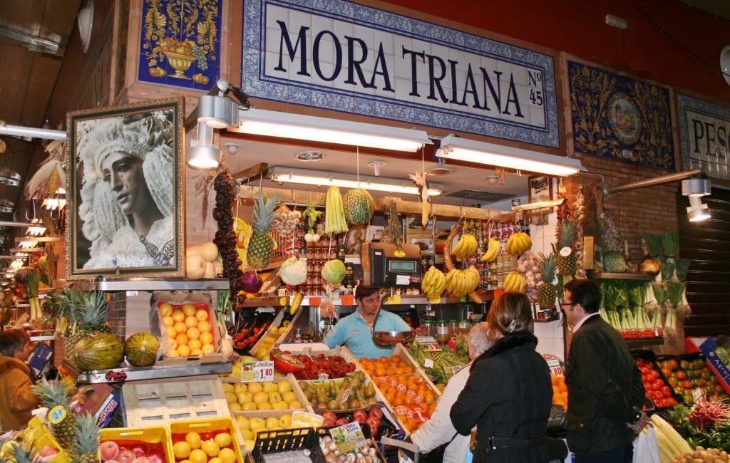 I pass by, to the frutas y verduras counter that brims with pyramids of pomegranates, apples, pimientos and plenty of cartoon-shaped squashes. You need to shout to be heard in Triana, in the markets, the bars and the streets, against the backdrop of constant chirruping and fragments of conversation.
