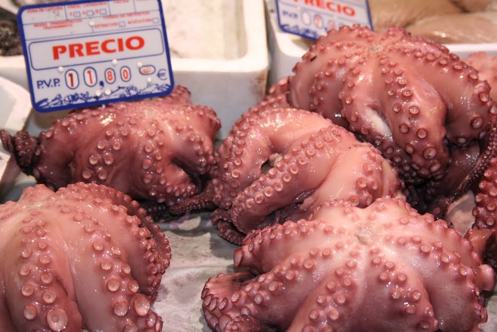 Back in the market, the meat counter is not for the squeamish. Tongues sit stacked together and whole legs of cured jamon hang by their hoofs from the ceiling. Next door, fish mouths gape open as a hefty woman guts and fillets the rest with the slickness and ease of a magician with a deck of cards.